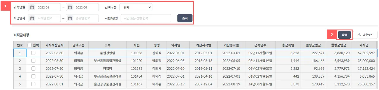 퇴직금 계산내역을 대장형태로 확인하는 화면입니다.