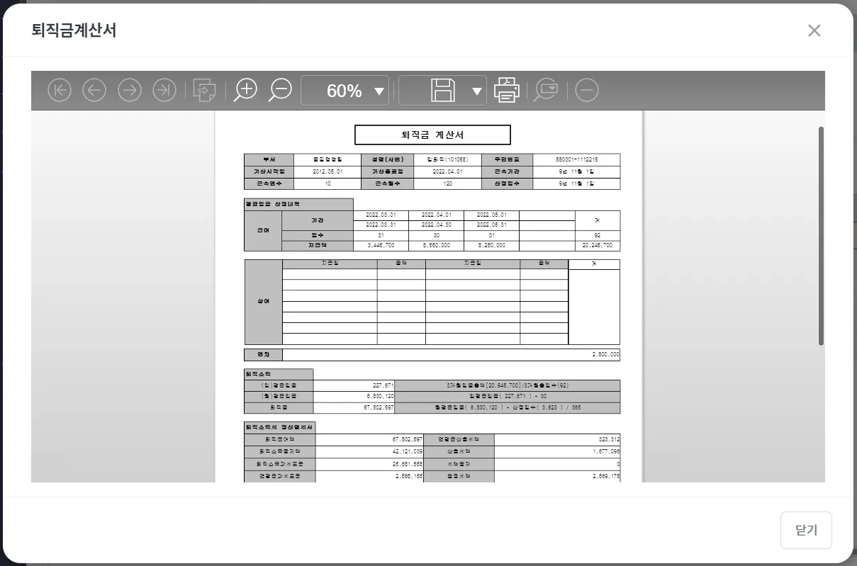 ② 퇴직금 대장 형태의 출력물을 확인하는 팝업 호출