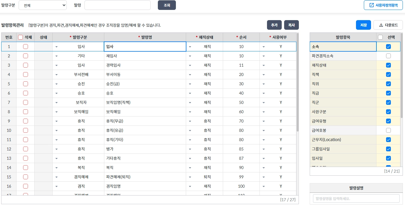 발령종류와 각 발령에 해당하는 항목을 설정할 수 있는 화면입니다.