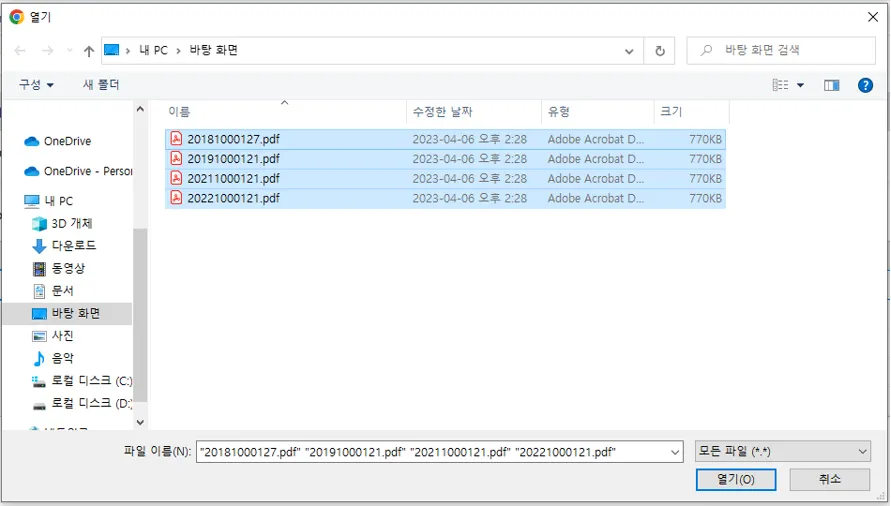 파일 업로드 팝업으로 다수의 PDF로 일괄 선택 및 등록이 가능합니다.