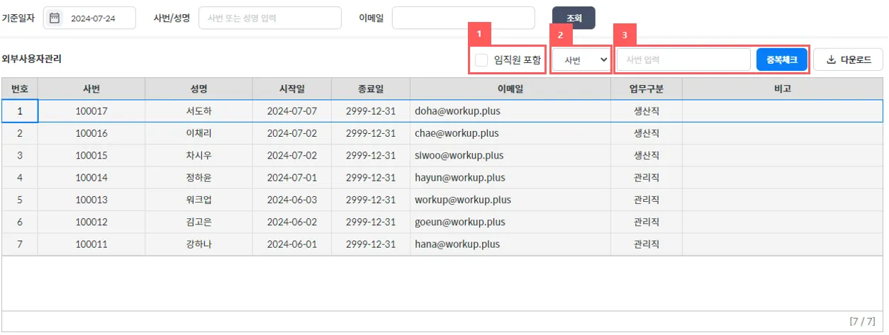 WORKUP 등록인원이 아닌 외부 사용자 리스트를 확인하는 화면입니다.