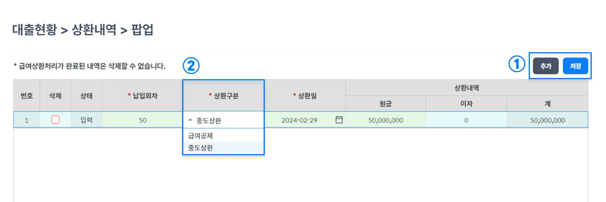 ② 신청한 상환기간 및 금액에 대해 담당자가 확인 및 수정하여 확정 데이터를 관리합니다.