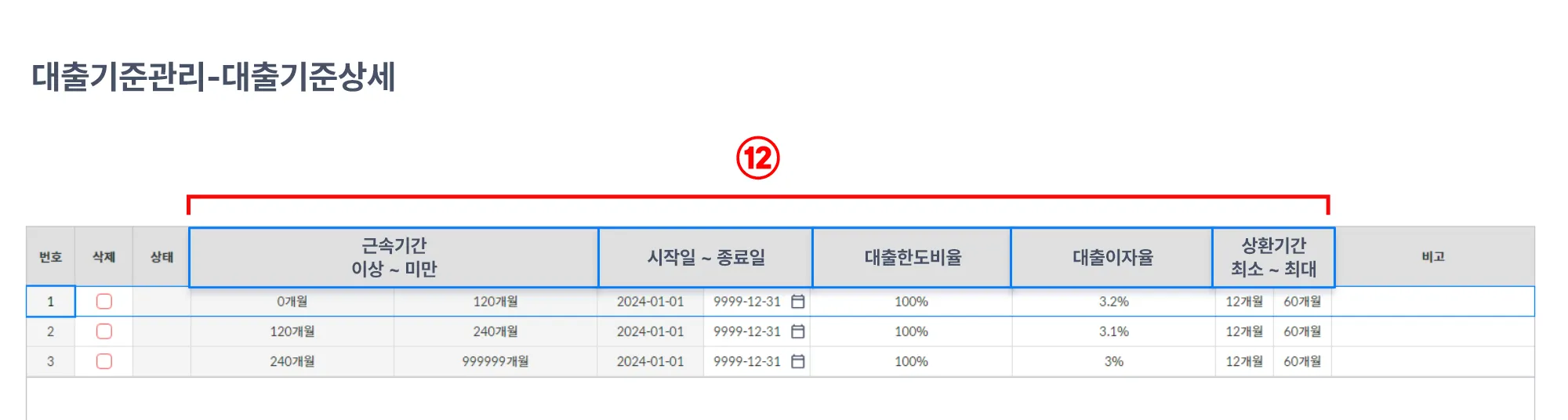 ⑫ 선택된 대출구분에 따른 근속기간별 대출한도와 이자율을 상세하게 구성