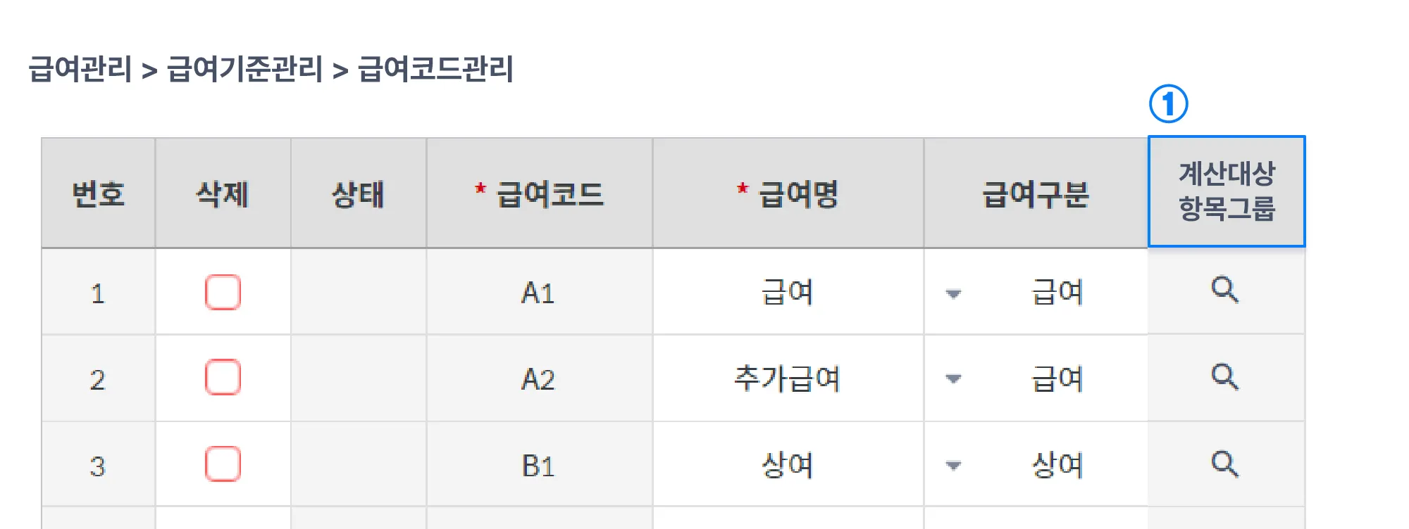 급여코드별 수당/공제 항목을 구성하는 화면입니다.