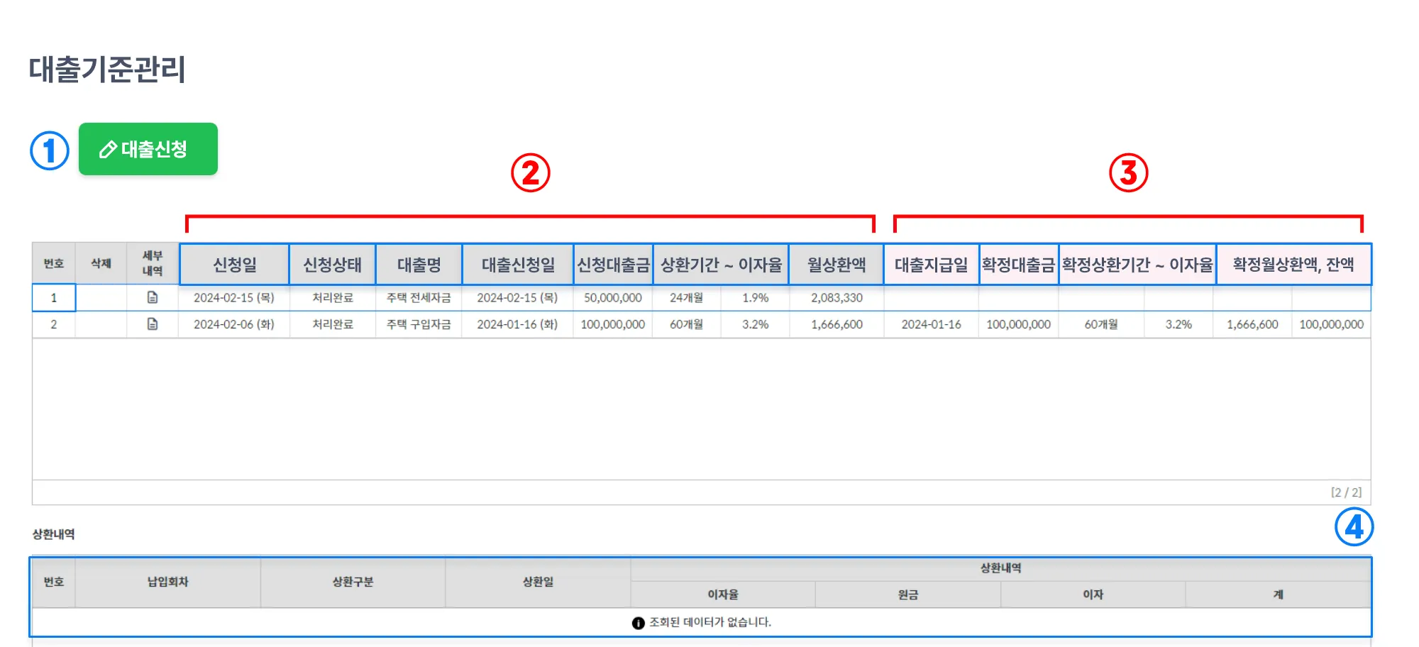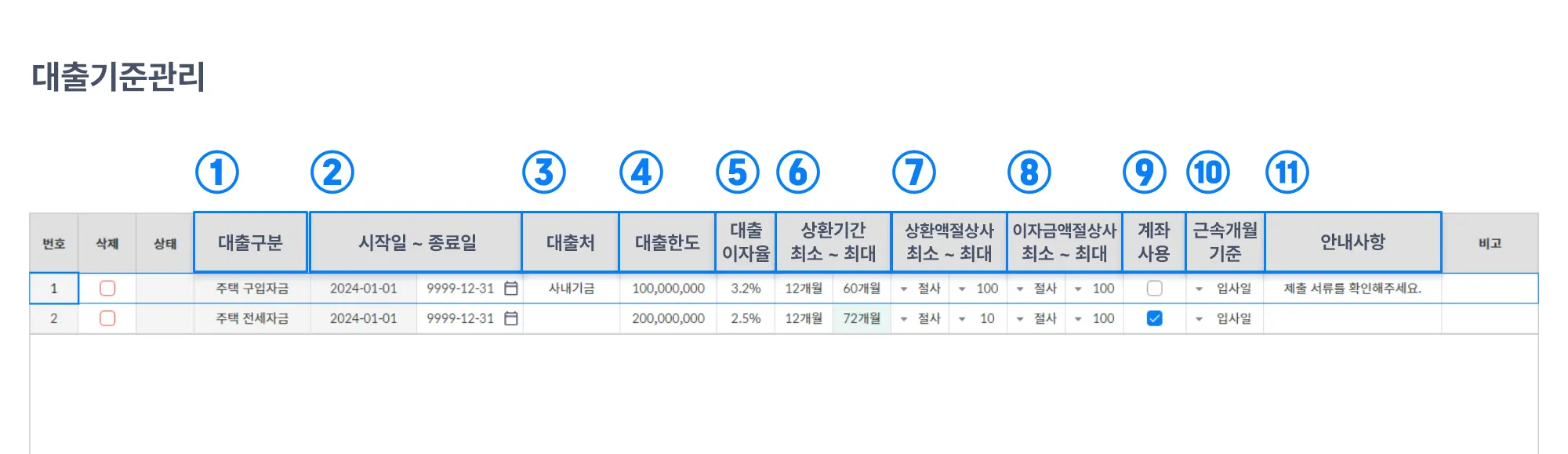 회사에서 운영하는 대출기준을 관리하고 대출 신청 및 현황을 관리할 수 있습니다.