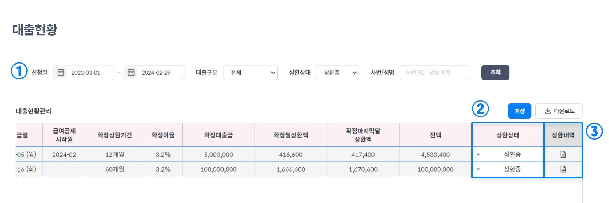 ③ 대출신청 이후 담당자가 확인 및 수정한 내역 확인