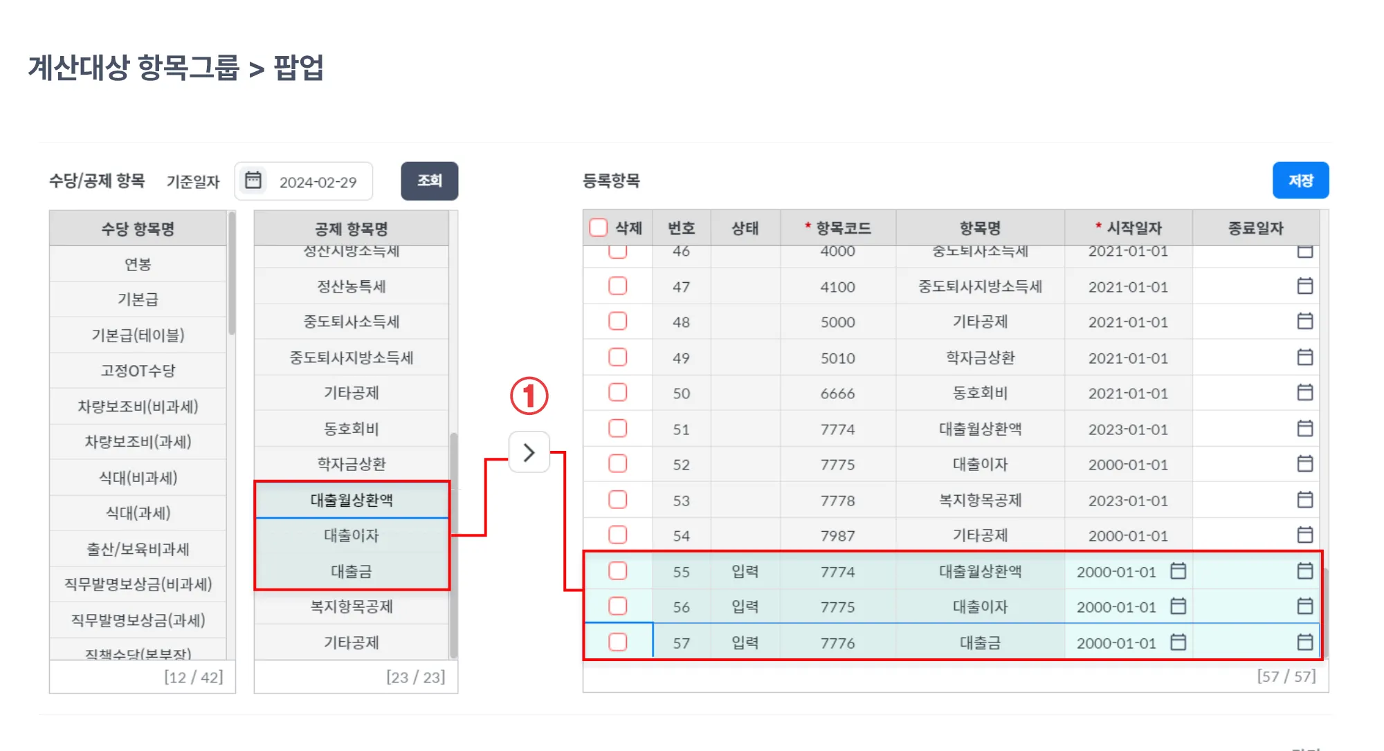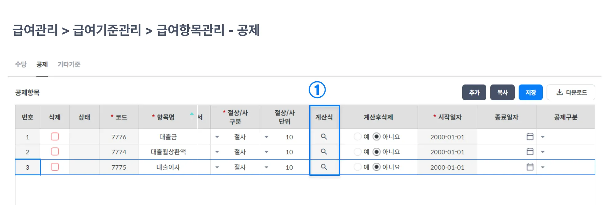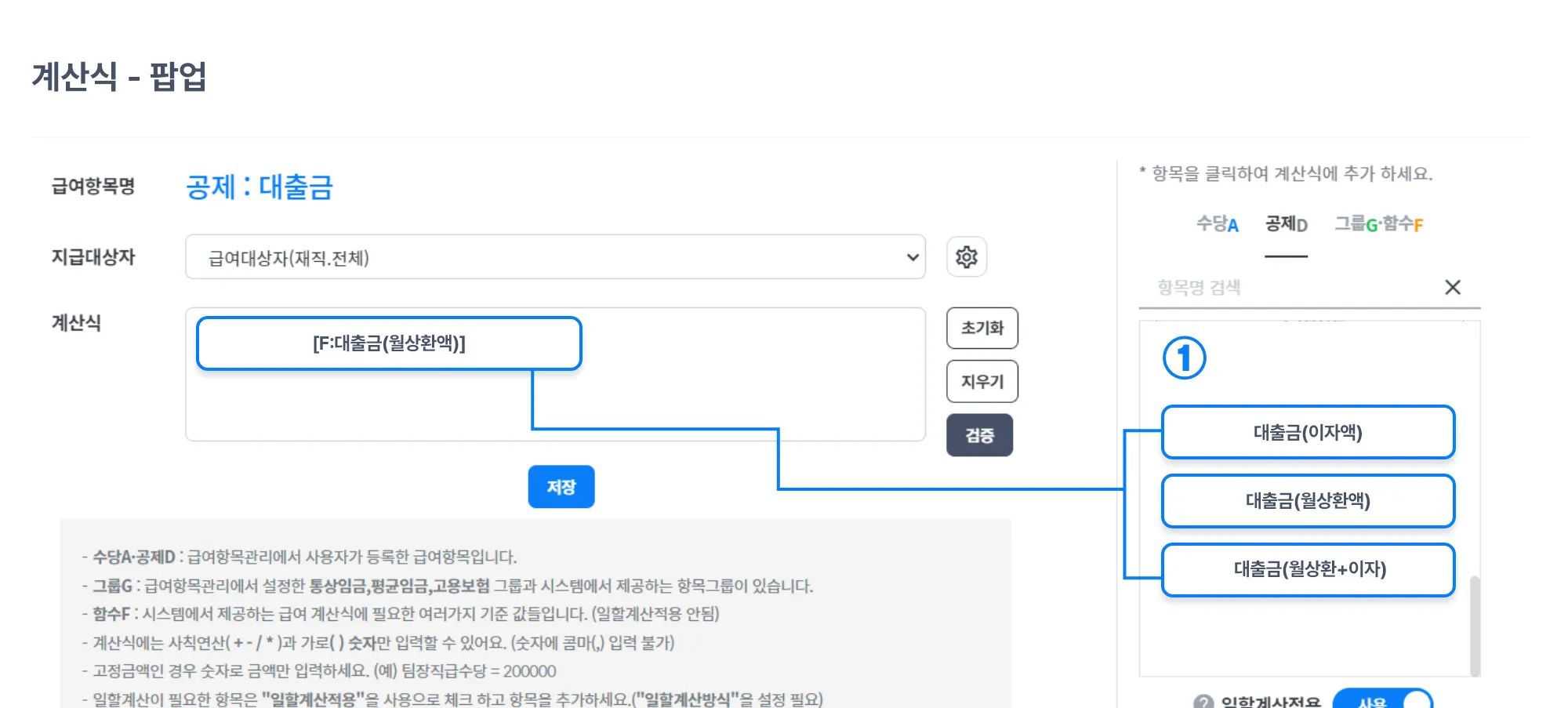 ① 대출 계산식을 적용할 공제 항목을 선택 및 계산식 팝업 호출