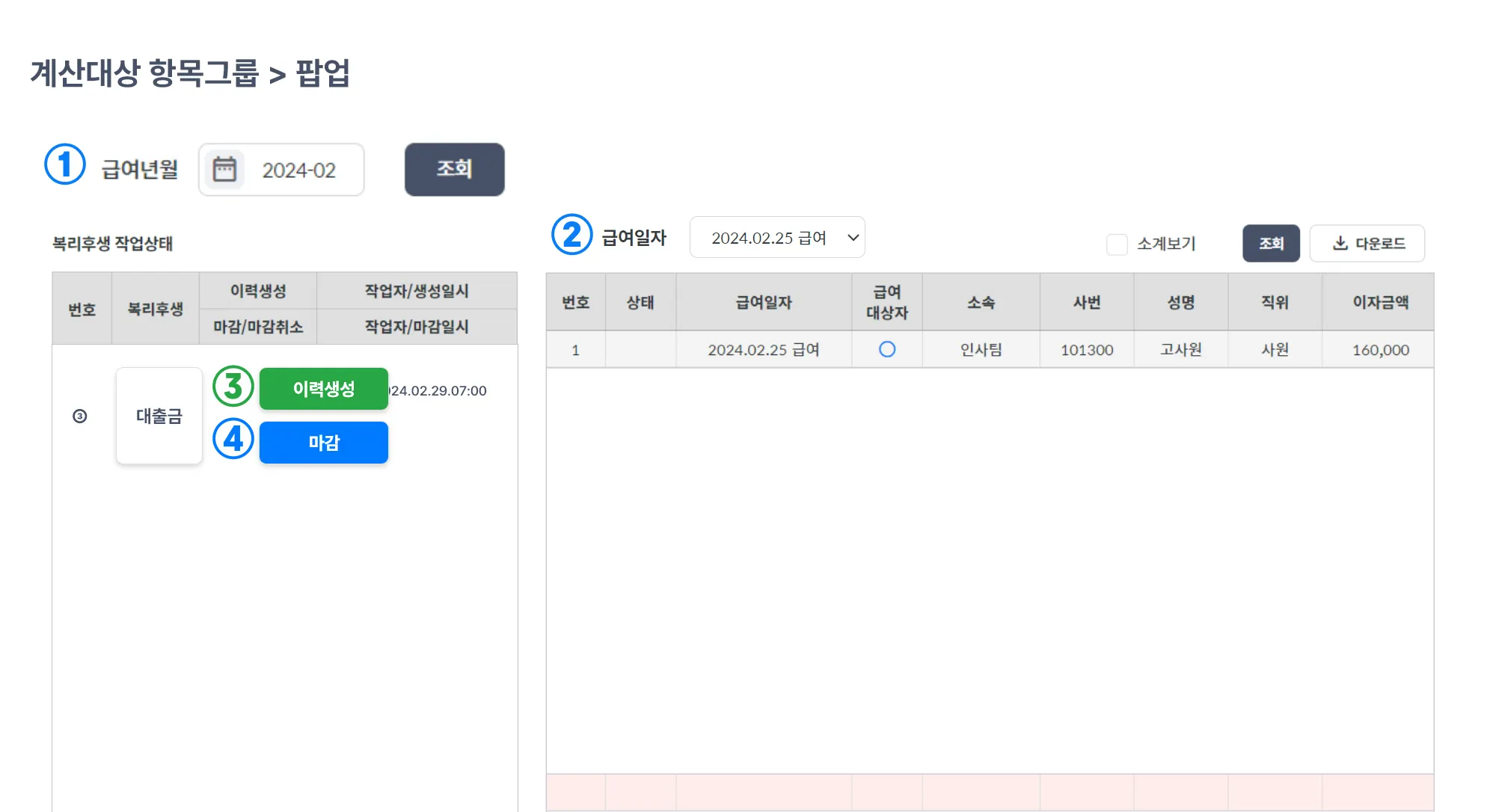 복리후생 신청건들을 급여에 연계작업하는 화면입니다.