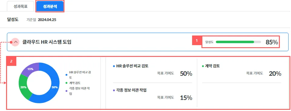 등록한 성과에 대해 달성도를 확인하는 화면입니다.