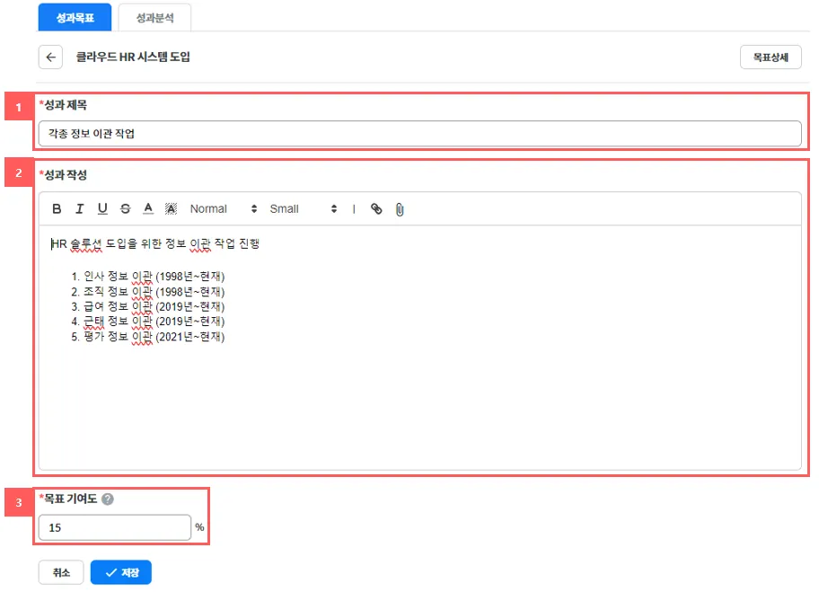 선택한 업적에 대한 상세 성과를 등록하는 화면입니다.