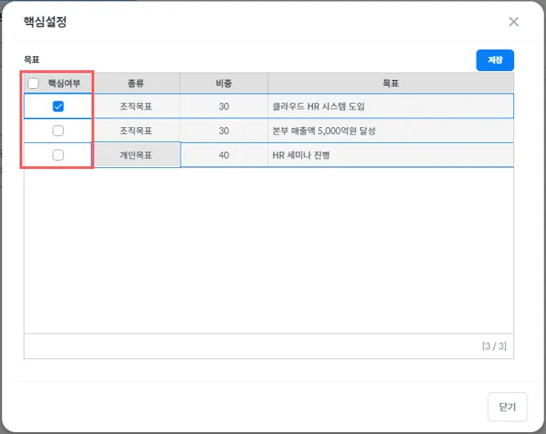 이미 등록된 업적중에 성과관리 대상이 되는 핵심 업적을 선택하는 팝업입니다.