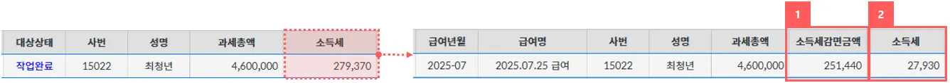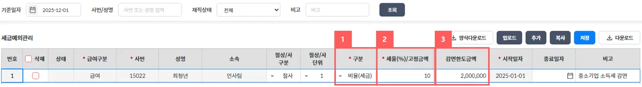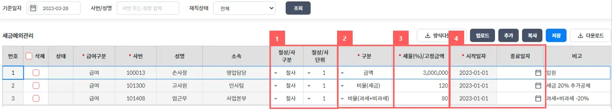 개인별 세금 예외처리를 관리하는 화면입니다.
