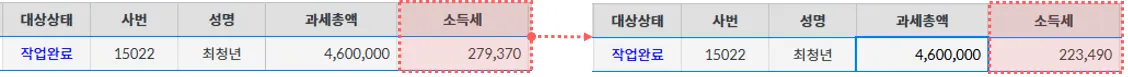 근로소득 간이세액표 계산시 279,370원 (100% 기준)
