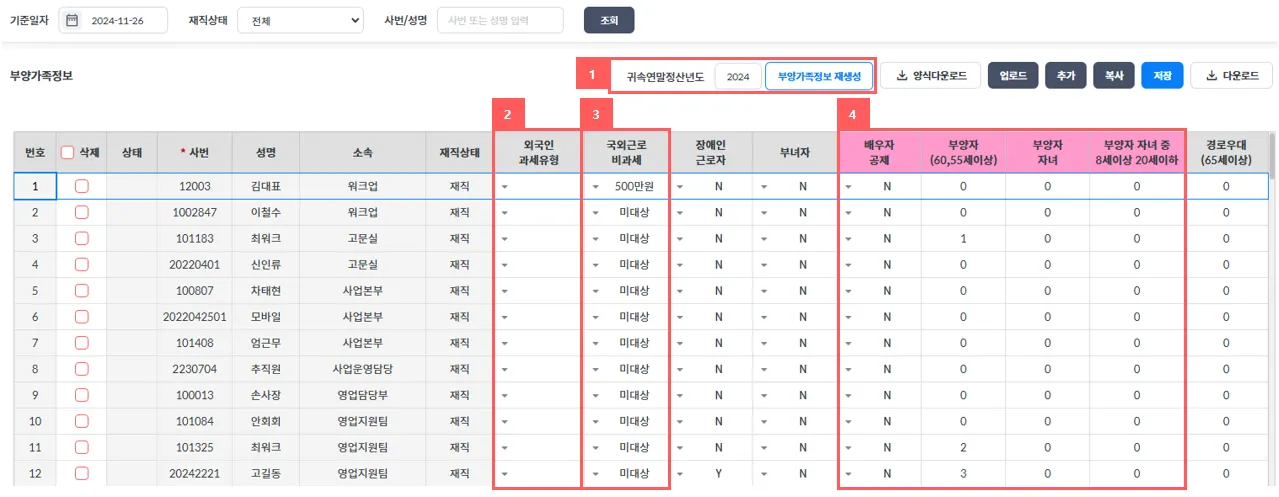 ① 연말정산을 끝내고 해당 귀속년도 기본공제 대상으로 등록된 인원으로 부양가족 정보를 갱신