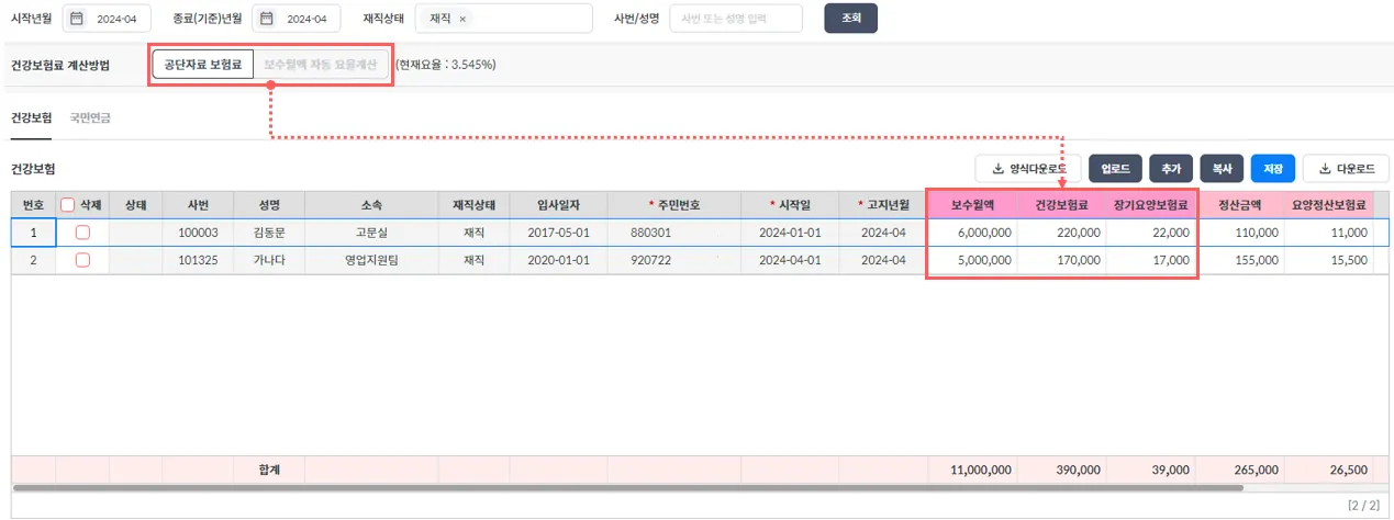 건강보험, 장기요양보험료를 공란으로 관리하면 보수월에 대한 요율로 자동 계산