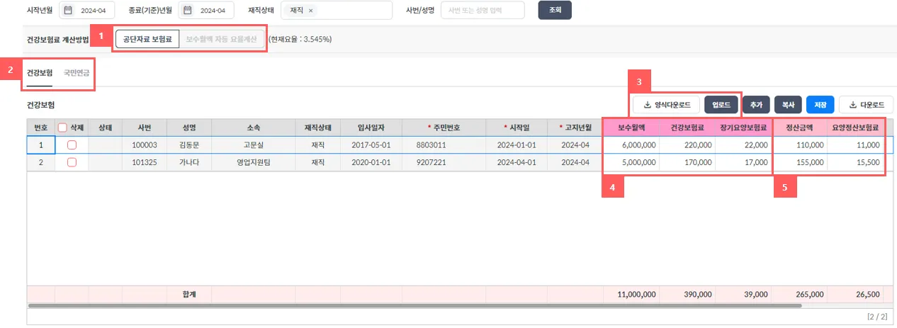 4대보험 계산방법을 설정하고 공단에서 제공하는 건강보험, 국민연금 자료를 업로드 하는 화면입니다.
