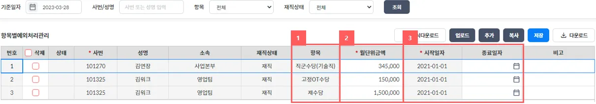 개인에 대해 수당/공제 항목을 특정 기간별 지속적으로 예외처리 할 수 있도록 지원하는 화면입니다.