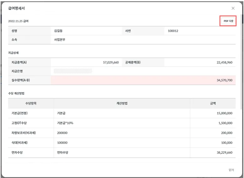 계산방법이 명시된 급여명세서를 확인하는 팝업으로 PDF로 다운로드도 가능합니다.