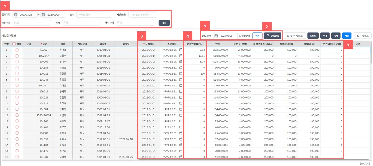 ⑤ 급여테이블이 갱신될 경우 기존 자료에 종료일자를 일괄로 부여하는 기능