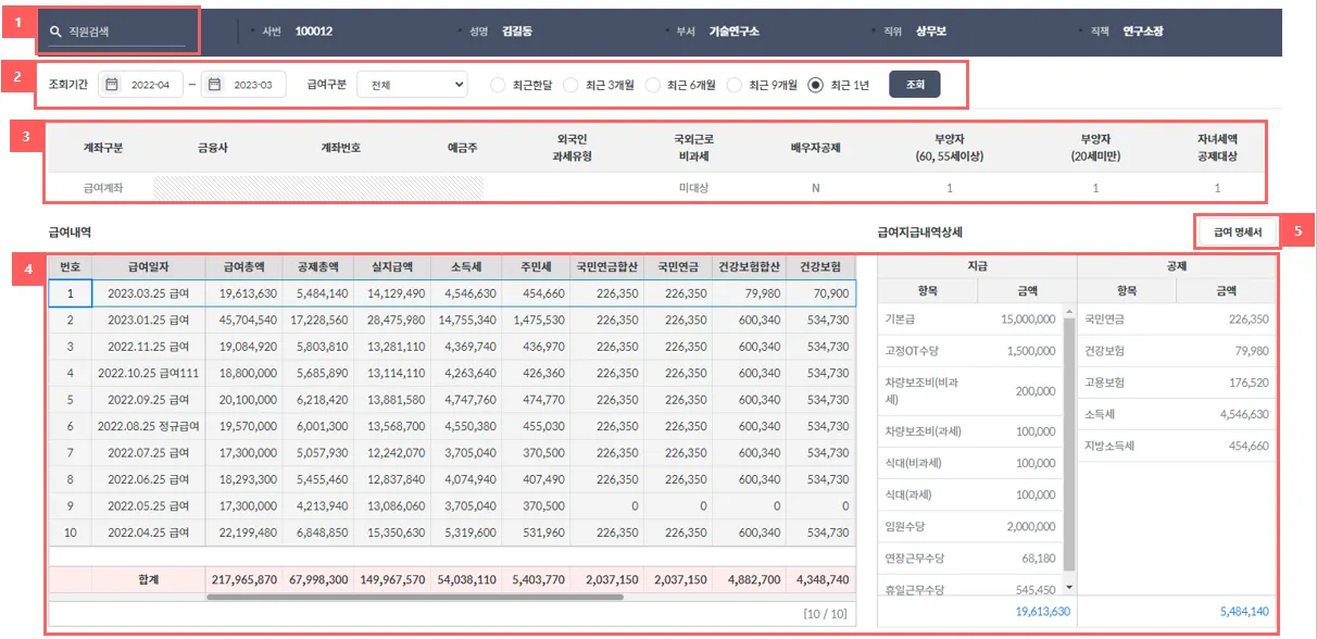 개인별 급여내역을 확인하는 관리자 전용 화면입니다.