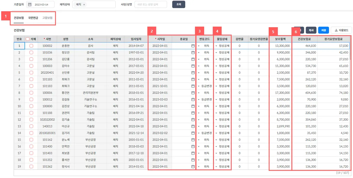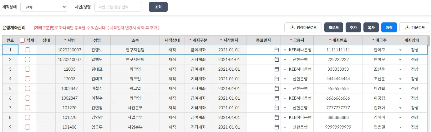 은행계좌, 개인별 연봉, 4대보험 업로드등과 같은 기능을 제공합니다.