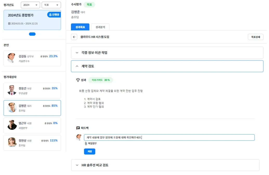 성과 확인을 할 팀원들과 상세 업적, 성과등을 확인 및 피드백하는 직책자 화면입니다.