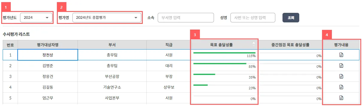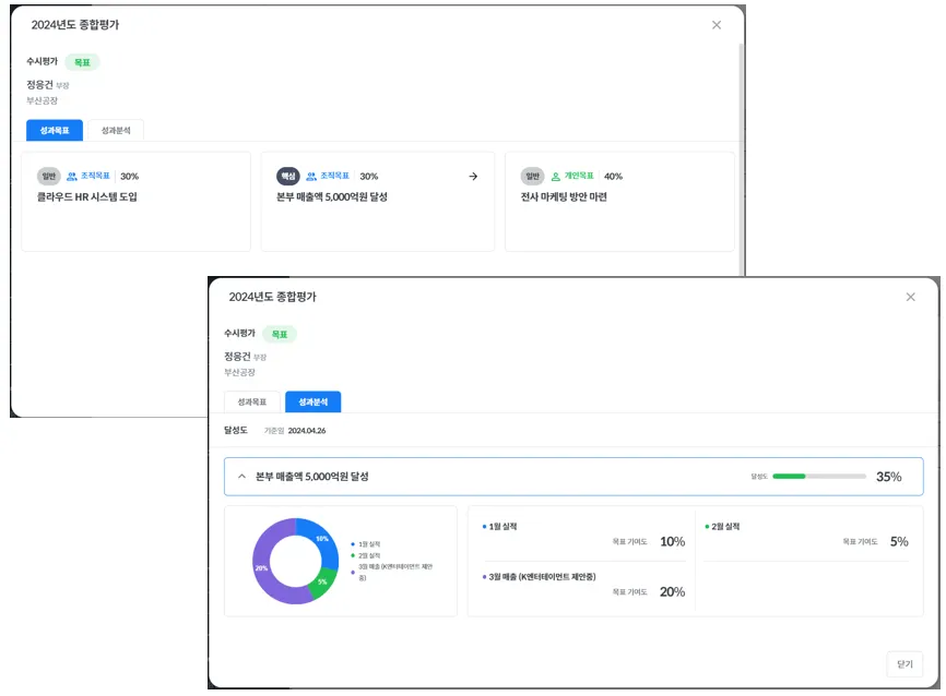 직원들의 성과관리 내용을 리스트 및 상세 파업으로 보는 화면입니다.