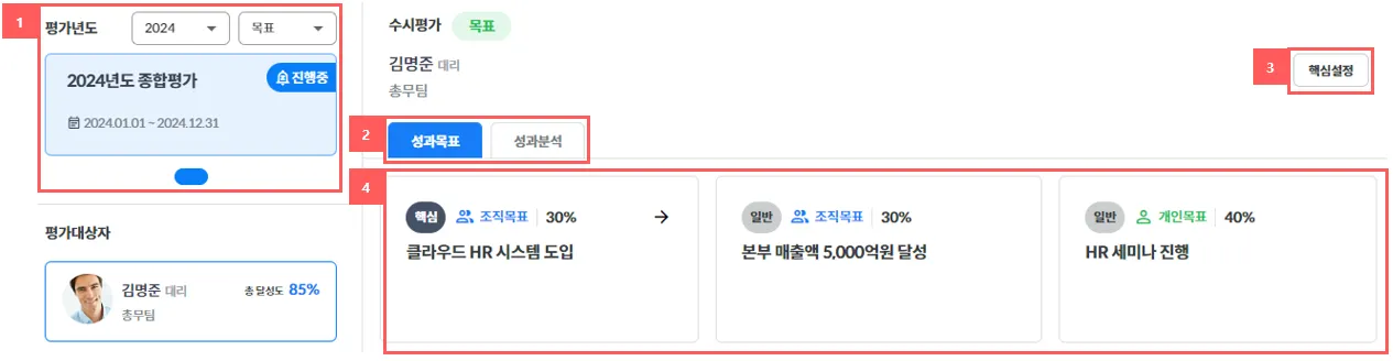 등록한 목표 중 핵심 업적에 대해서 수시평가(성과관리)를 할 수 있습니다.