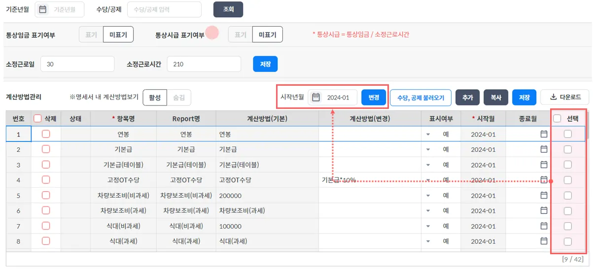 계산방법 관리에 시작일자 키 값을 일괄로 변경할 수 있는 기능이 추가되었습니다.