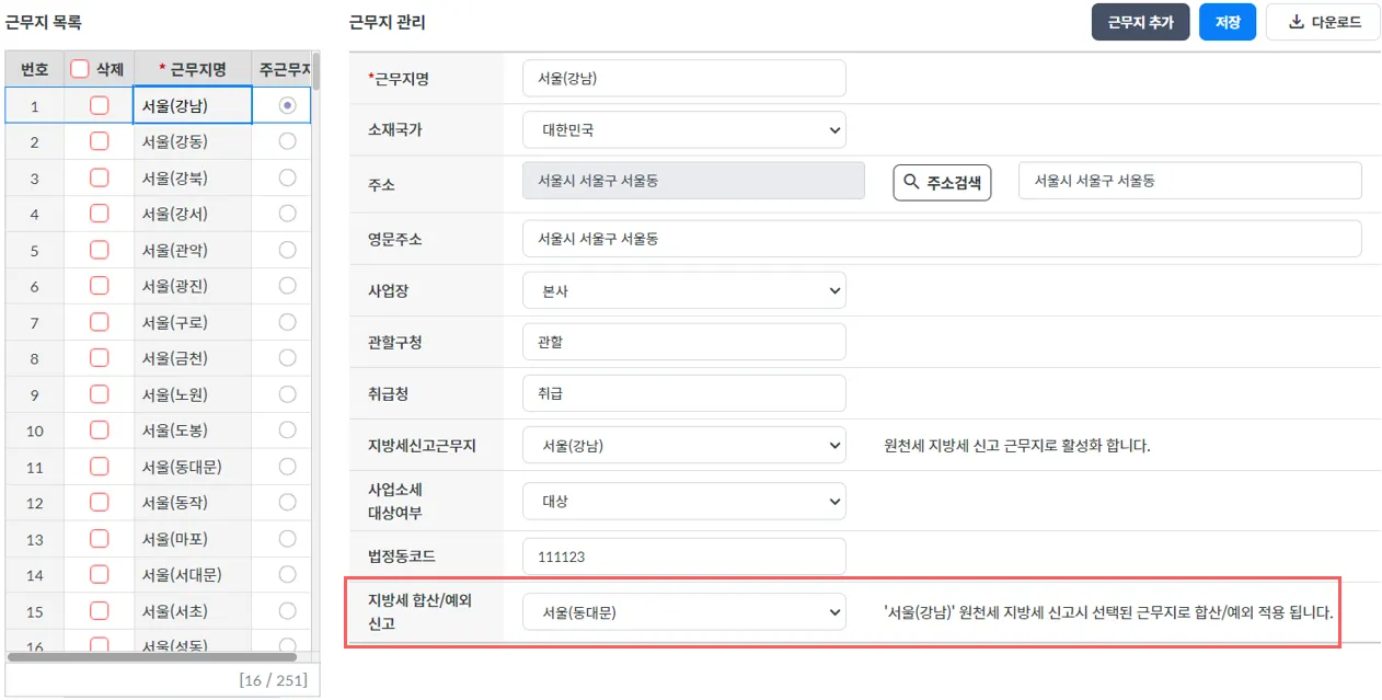 선택된 근무지에 대해 지방세 합산/예외신고 근무지를 지정할 경우, 원천세-지방세 신고시 합산/예외 처리되어 적용됩니다.