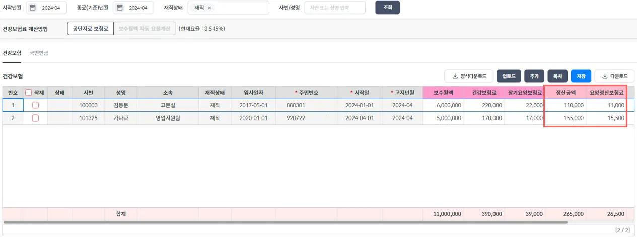 공단자료 보험료 : 공단에 있는 업로드된 금액으로 보험료가 계산됩니다.