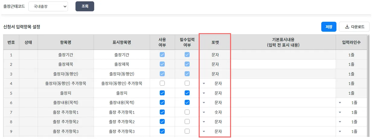 출장기준 옵션 ‘포맷’이 추가되었으며 문자, 숫자형으로 커스텀 컬럼을 제어할 수 있습니다.
