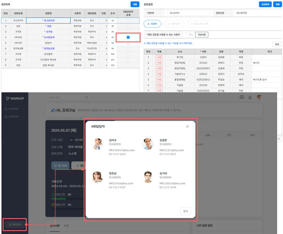 메인화면 HR담당자에 대상자를 권한별로 구성할 수 있습니다.