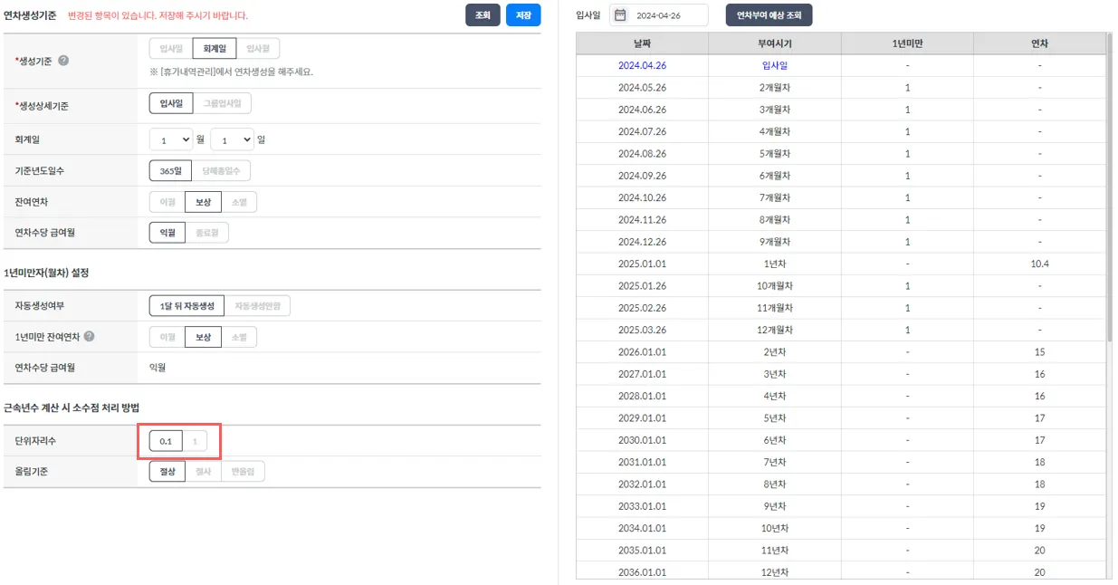 근속년수 계산시 0.1 옵션을 추가되어 0.1, 1 두자리 수만 활성화 되었습니다.