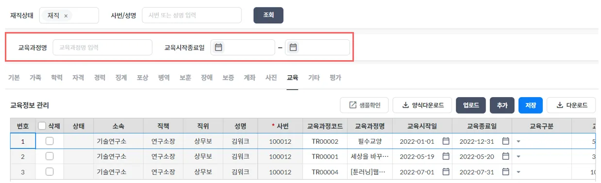 3) 교육 탭 교육과정명, 교육시작/종료일