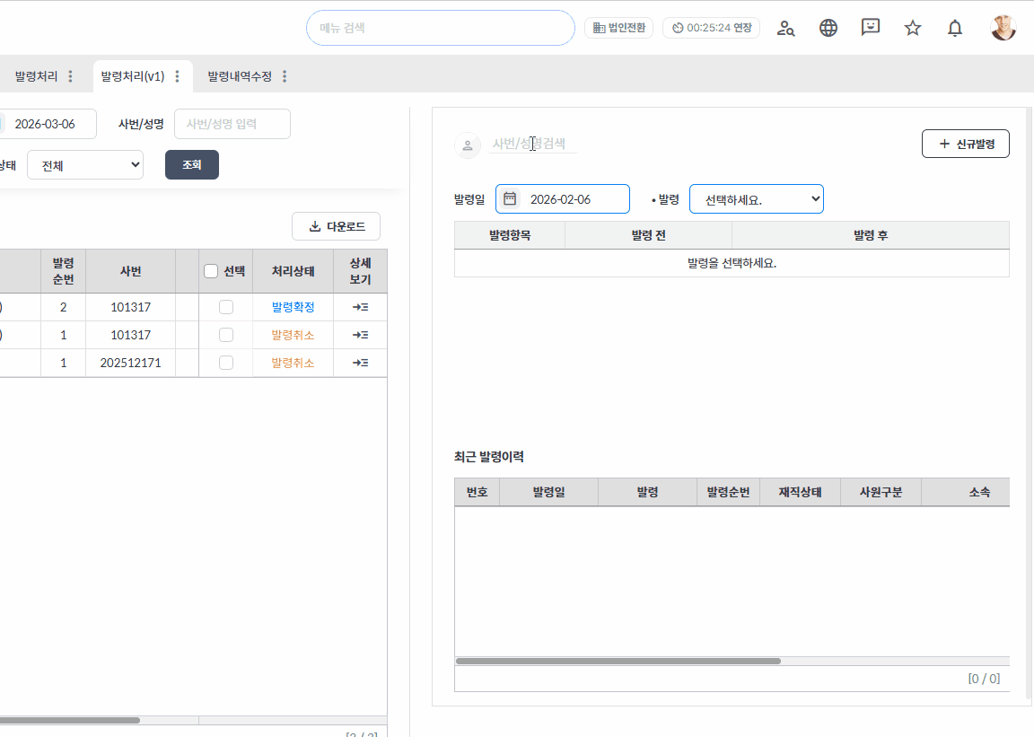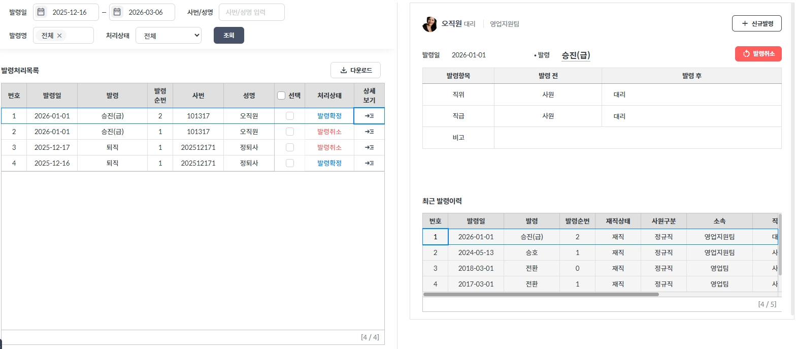 발령 작업을 진행할 대상자 검색을 시작으로 발령 일자를 지정하고 발령처리 업무를 진행합니다.