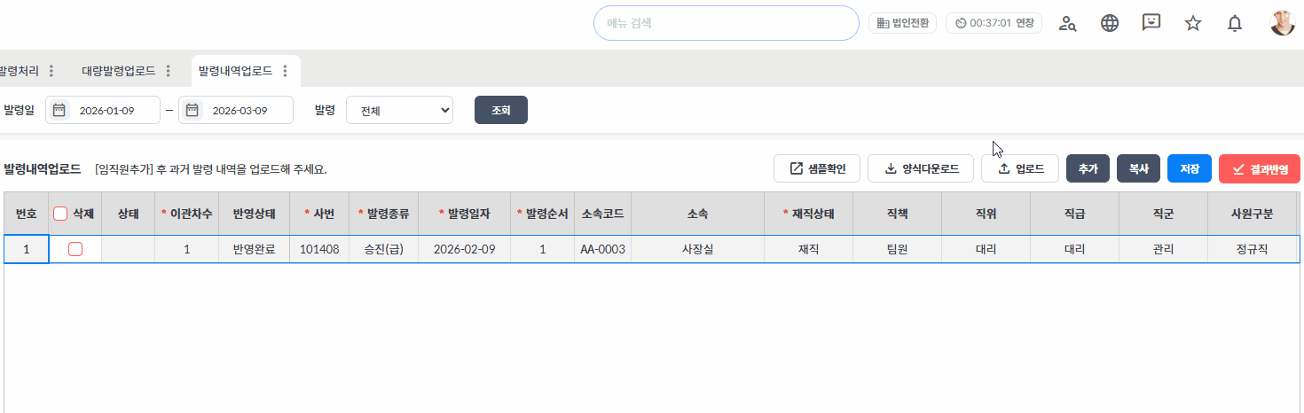 2. 발령내역 일괄 업로드