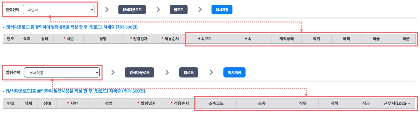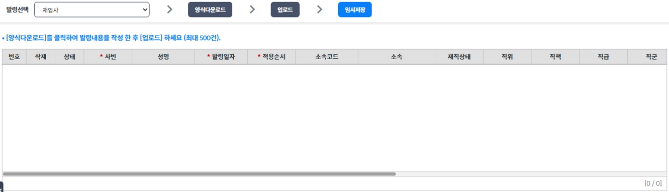 업로드할 발령을 선택하고 → 양식다운로드 → 업로드 → 임시저장 순으로 진행하면됩니다.