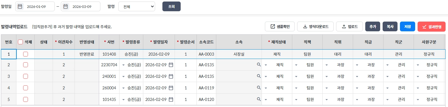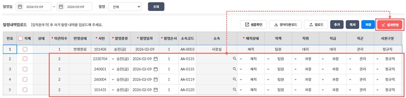 결과반영 버튼을 통해 업로드된 내역을 임직원들의 실제 발령이력으로 등록합니다.