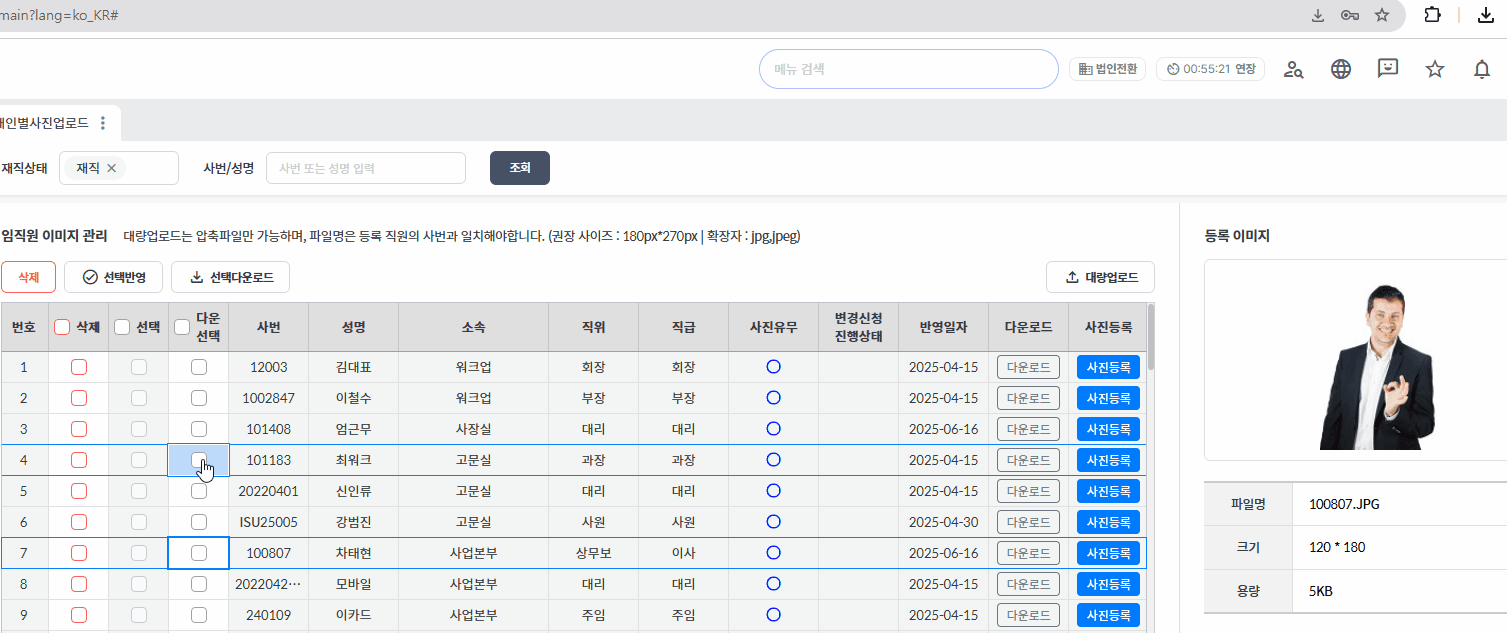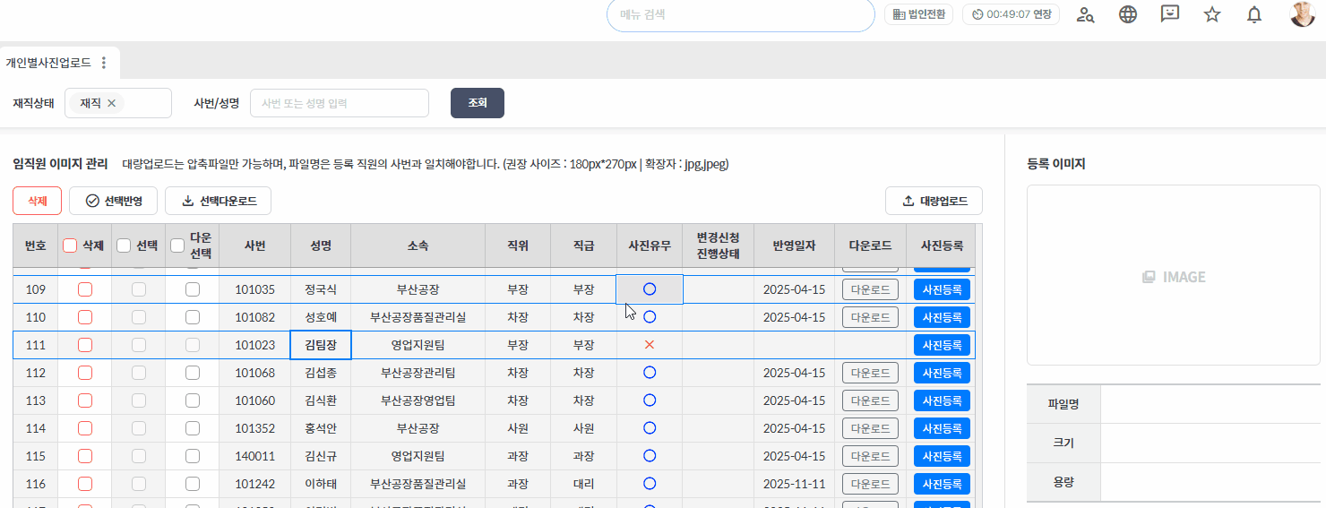 임직원들의 사진을 확인 및 등록하는 화면입니다.