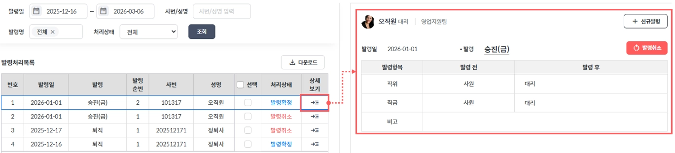 이미 처리한 발령내역은 상세보기를 통해 발령 전, 발령 후 데이터를 확인할 수 있습니다.