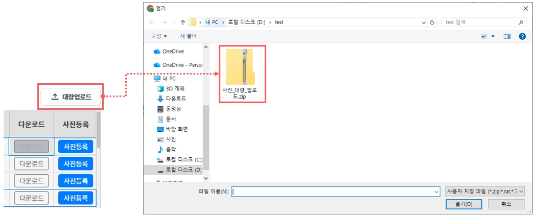 개별이 아닌 대량 사진 업로드가 필요할 경우 사진들을 압축파일로 묶은 후 대량업로드 버튼을 통해 작업할 수 있습니다.
