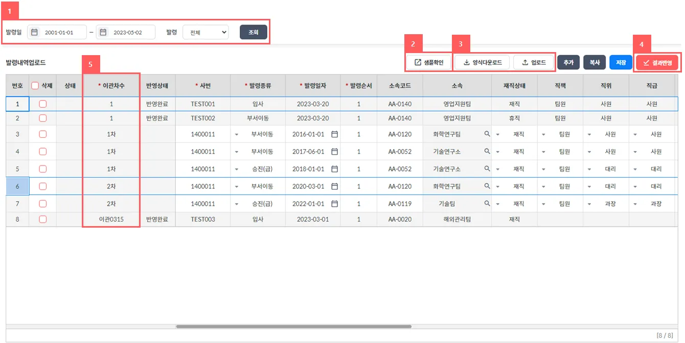 결과반영시 바로 발령처리가 진행되며 재작성이 필요할 경우 다시 업로드 하면 지우고 등록됨