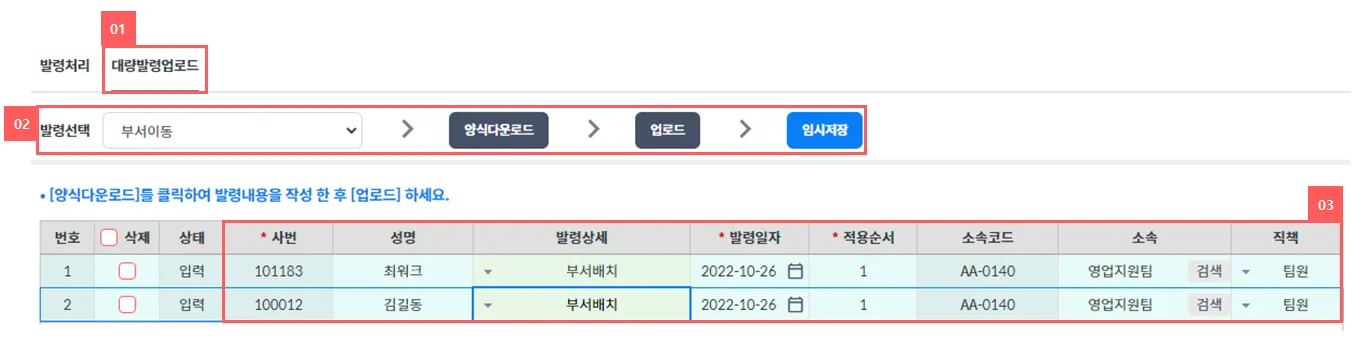 ③ 샘플확인을 통해 양식다운로드 하여 발령사항을 작성 후 업로드
